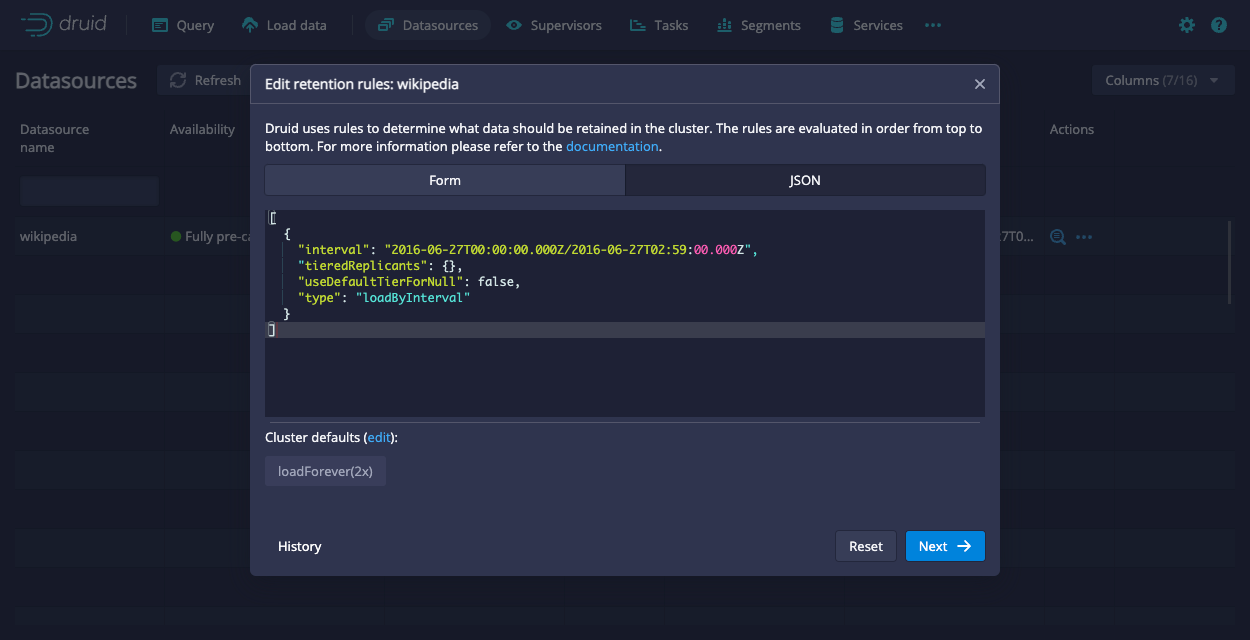 You can configure the load rules through the API or the Druid console. To configure the load rules through the Druid console, go to Datasources > ... in the Actions column > Edit retention rules. Then, paste the provided JSON into the JSON tab: